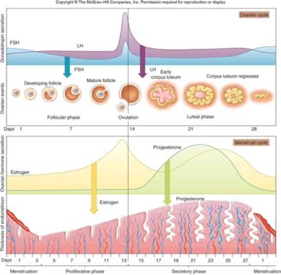- Occurs as a result of the fall in estrogen and progesterone when the corpus luteum degenerates