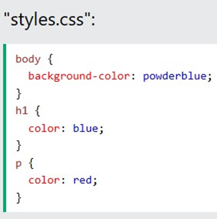 The external style sheet can be written in any text editor. The file must not contain any HTML code, and must be saved with a .css extension. Here is what the "styles.css" file looks like: