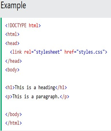 An external style sheet is used to define the style for many HTML pages. To use an external style sheet, add a link to it in the <head> section of each HTML page: