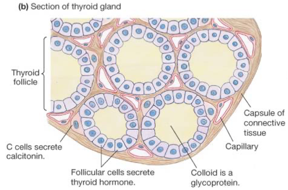 - Follicles – spherical units filled with colloid (thyroglobulin).