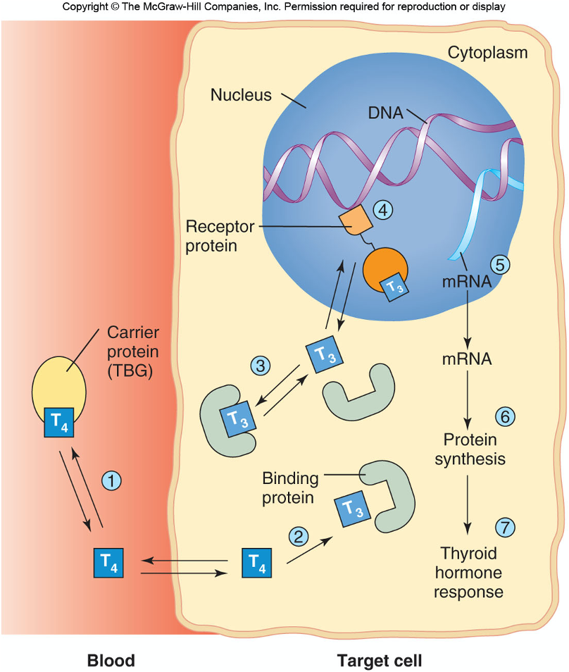 - Thyroxine (T4) travels to target cells on thyroxine-binding globulin (TBG).