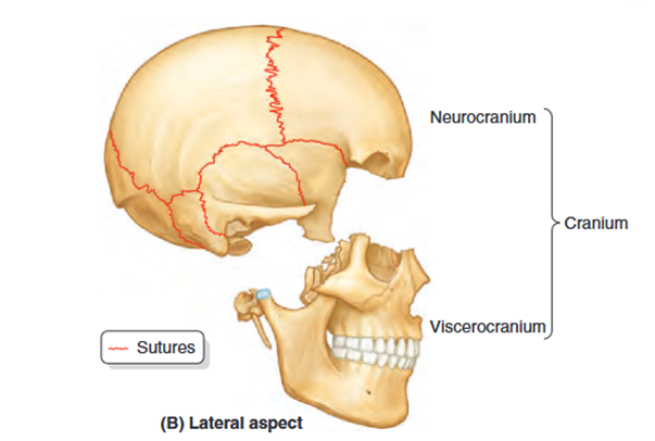 The cranium, or skull, serves as the skeleton of the head and is composed of two main parts: the neurocranium and the viscerocranium. The neurocranium encases the brain and its protective coverings, the cranial meninges, while also housing the proximal parts of cranial nerves and the brain's blood vessels. In adults, the neurocranium consists of eight bones: four singular bones aligned along the midline (frontal, ethmoidal, sphenoidal, and occipital) and two pairs of bilateral bones (temporal and parietal).
