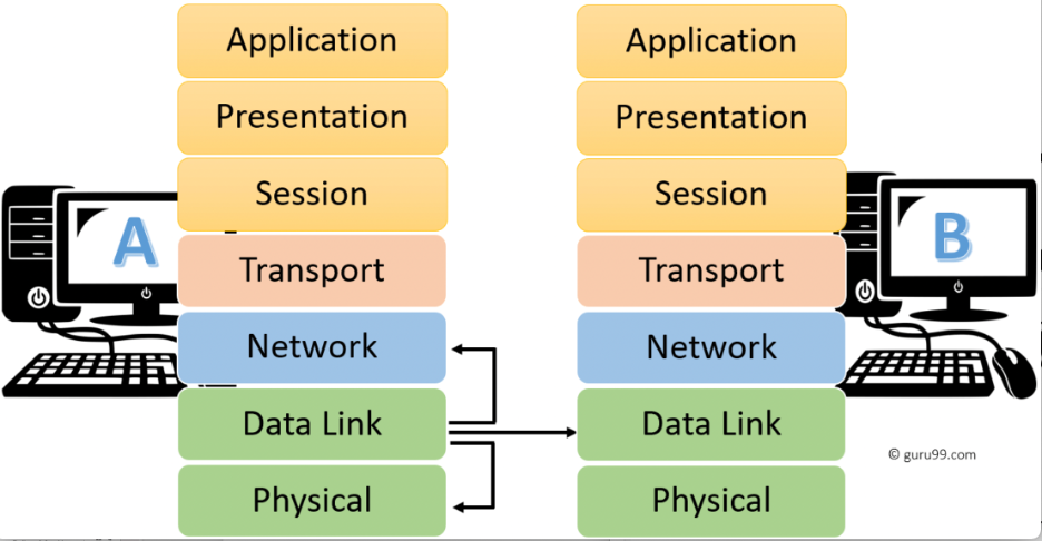 Every layer in an OSI model is in communication with both its peer layer in another networked computing system and the other two levels that are below it as showed in figure 2.2. The data link layer of the first system communicates with the network layer and the physical layer of the system, as shown in the picture below. It also facilitates communication with the second system's data link layer.